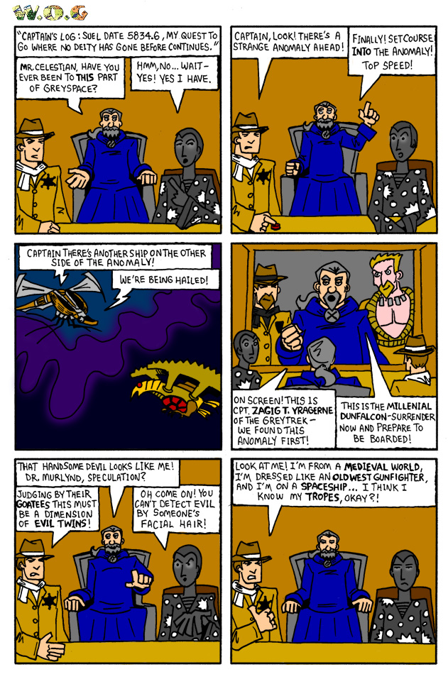 Tropes are a commonly discussed topic online. It is virtually impossible to create a new trope, all one can do is take an existing one and do it so well that you make it your own. The evil twins with goatees of course come from Star Trek which is the show this arc parodies. The evil doubles presented have not been introduced but a couple are already from published sources. Kudo points to any who can name them. Hmm, I have a goatee I wonder if that means my double is Good? p.s. The title Dr D.R. Murlynd F.K.O. M.L.T.S.A. comes from the 1E module Land Beyond the Magic Mirror. In Oerth Journal #6 Gary Gygax answered what the acronym stands for: Fellow of the Khans of the Orient, Member Lake Geneva Tactical Studies Association. So yes, Murylnd knows his tropes. ;) |