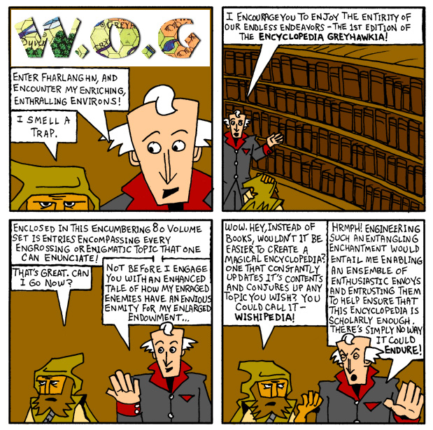 Though I can't find a link for it any longer(Help anyone?), the Encyclopedia Greyhawkia is a real thing I swear. In fact I suspect it was penned under one of Delleb's pseudonyms, Jason Zavoda. Greyhawkia truthfully, is only an index of all things Greyhawk, but that is still no small feat to claim. As it came about before the wiki-explosion it is still one of the most remarkable fan creations to date. When I was growing up as a quizical lad, my parents had a huge 20-something volume set of Encyclopedia Americana books. I don't know how many school papers I researched from those dusty old black books (or how many forts were made for army men by stacking them), but I do know I kept going to them as a resource until the early 90's. When I was going to college in the 90's professors adamantly didn't want you using the 'World Wide Web' for research so it wasn't so daunting for someone like me who was used to hunting through libraries and my house for stuff to pad my bibliography. It's been a longtime since I've done a paper(for a grade at any rate), but I suspect nowadays it would be VERY hard for teachers to prevent students from using the Internet, especially with the advent of wikipedia and its clones. Wikis have both a good reputation as a font of all knowledge imaginable all in one place and a bad reputation as a resource with at best unreliable second hand information. I can see why wiki isn't liked. How can dictionary, encyclopedia and primary source writers compete with wikipedia and its legions of multinational volunteer writers? Wikis also have unlimited page space, crosslinking between relevant articles and they don't weigh as much as a tank. Even better, Wikis cover RPGs and Greyhawk in a suitable well-researched fashion as gamers are a fanatical lot. I suspect the biggest print Encyclopedias out there doen't even bother with anything beneath Lord of the Rings or Harry Potter fiction. So, thanks for the help! Kudos to all Greyhawk index and wiki writers, you know who you are. update: thanks to chatdemon for the heads up on where to get the index and maldin for hosting it on his site. You can get it here if you don't have it already. Greylore: First | Previous | Next | Front page |