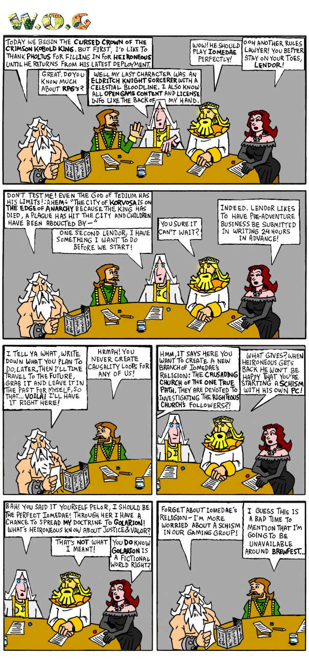 Poor Lendor. This comic illustrates common caveats to DMing especially changing players mid-campaign. I for one am very familiar with having friends in the military come and go. That is always hard to handle but it makes their occasional returns all the better. Another uncomfortable moment for anyone is introducing a new player and gauging them for their "gamer-experience". Some are more proud of it than others... Then there is the issue of having enough time for all the players' "side-stuff" when running a series of adventures (usually published ones). Most GMs will try and limit personal agendas to move the game along, but in open ended games I've often seen side-stuff BECOME the adventure. Player friction and infrequent real-life events interfering with game-night are also weekly concerns that can crop up. With all this stuff to juggle its amazing anyone would want to be DM! p.s. For the Paizans out there, the parody adventure the gods are playing is a double homage to yes, once again, author Nicolas Logue. ;) |