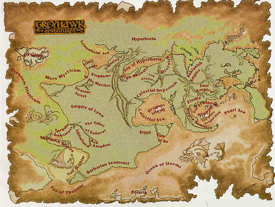 Gygax writes, concerning the 1980 World of Greyhawk Folio: "The maps show only a portion of the world. It is a very large and significant portion, but it is nevertheless a part of the whole, and during the course of the campaign, players have certainly adventured over more than it depicts. The Gazetteer is basically a survey of the states and geographical features. Some details were omitted so as to allow development by individual DMs, some because they are still 'unknown,' and a few because they will be revealed elsewhere as the need arises." - Greyhawk: The Shape of the World, The Dragon #37 As was noted earlier, Gygax and friends had decided to slowly expand the scope of the published setting with a series of small-scale, but highly detailed maps of the important regions of the Flanaess. The details would've included things like major NPCs and suitable encounters. This would have had to have been in addition to Gygax's monthly articles in Dragon where he and later Rob Kuntz began to give political updates to the nations of the Flanaess and sometimes pivotal NPC groups like the Knights of Doom in Dragon #59. Then in his column in the same issue Gygax briefly made mention of a product called "Wasp Nest: The City State of Stoink". No sign of this work ever surfaced. Gygax had from the beginning wanted to finish the entire globe of Oerth and to this part he was willing to add the works of other authors as well. ""Francois had a map of a continent and some islands to the east, and they were going to be added. The "Orient" was actually to be past them, closer to the West Coast of Oerik... Len Lakofka had an eastern continental addition as well as the Lendore Isles, so what I planned to do was incorporate Francois' and Len's maps with Oerik, complete the lower continent below it, and have a real globe." "Gary Gygax: Q & A (Part VI, Page 4)". EN World. Frank Mentzer, also had plans to have Gygax use his eastern land of Aquaria from a series of four RPGA modules. Even stranger, in Dragon #102 Coming Attractions there is a mention of the upcoming Oriental Adventures hardback book which was promoted as "the Oriental lands of Oerth." As this was near the end of Gygax's tenure at TSR, it was later discreetly unattached from Greyhawk though later indiscreetly reattached to the newly popular Forgotten Realms. |