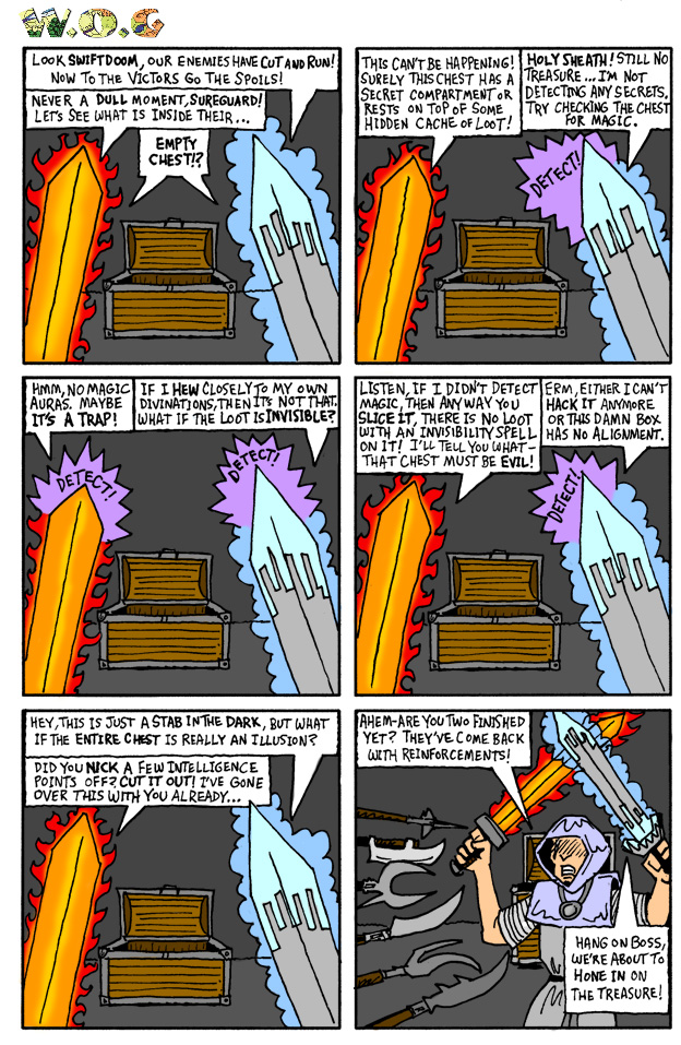 One of the cruelest tricks a DM can pull on players is to make them risk their character's lives and then give them empty treasure containers. I know from experience that players will hunt for this elusive treasure to no end because big chests of gold in dungeons are put there for THEM to find damn it! And even if it DID have something inside they've been burnt so many times opening trapped chests that now, opening one sometimes takes more work than wresting it from the monster in the first place! Other inanities... 1. Sureguard and Swiftdoom both have a number of special powers useable at will. Sureguard (the frostbrand) can Read Languages, Read Magic, Detect Good/Evil, Detect Secret Doors, Detect Traps, use Telepathy, and cast Duo-Dimension (Which makes Kelanen a 2-d and invisible if turned sideways). Swiftdoom (the firebrand) can also Read Languages, Read Magic, Detect Illusions, Detect Magic, Detect Invisible Objects and cast Teleportation. 2. Open question. I am curious and not at all willing to look it up at this point, but does Detect Magic locate the magic emanations of invisiblity spells and illusions? If so, like in this comic, that would kinda make Detect Illusions and Invisible Objects pointless right? 3. Swiftdoom has a 17 INT and an EGO of 25. Sureguard has a 17 INT as well, and an EGO of just 19. I guess we can see why the Flaming Sword talks down to the Frost Sword even though they are the same intelligence... 4. The polearms arrayed against Kelanen (cause using swords against him is suicide) are, top to bottom (in 1e stats)... 5. Lucerne Hammer (150gp weight, 2d4dmg S-M, 1d6 L, 5'+ long, 5' space needed, speed factor 9) 6. Voulge (125gp weight, 2d4dmg S-M, 2d4 L, 8'+ long, 2' space needed, speed factor 10) 7. Military Fork (75gp weight, 1d8dmg S-M, 2d4 L, 7'+ long, 1' space needed, speed factor 7) 8. Fauchard (60gp weight, 1d6dmg S-M, 1d8 L, 8'+ long, 2' space needed, speed factor 8) 9. Fauchard-Fork (80gp weight, 1d8dmg S-M, 1d10 L, 8' long, 2' space needed, speed factor 8) 10. Glaive (75gp weight, 1d6dmg S-M, 1d10 L, 8'+ long, 1' space needed, speed factor 8) 11. Have fun reading. |
