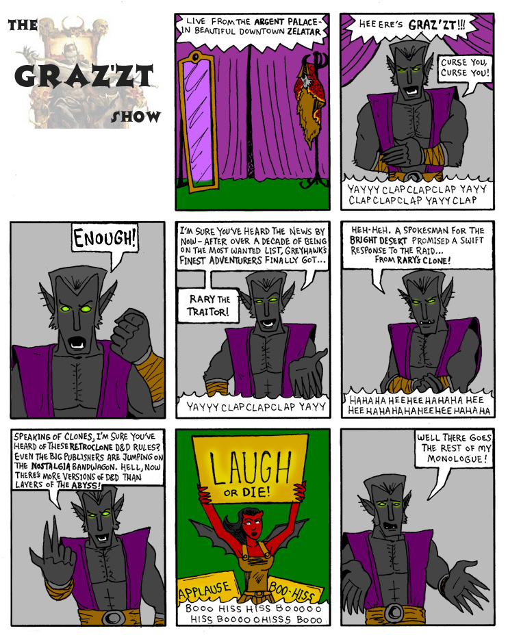 1. Why didn't Greyhawk City respond to Rary's treachery at end of the Greyhawk Wars sooner (if at all)? Why didn't the Circle of Eight launch a reprisal either? Both let Rary set up shop in the Bright Desert and create the Bright Lands, a realm formidable enough to hold off the Greyhawk domain. Sure Rary is quite powerful, but so is Mordenkainen. There are some, like myself who think Mordenkainen was in cahoots with Rary. Anyways, not until Living Greyhawk's waning years did Rary and his machinations get explored in a series of Core adventures. To this day I don't know what the 'official' outcome of that storyline was, but I have a hunch Rary either came out on top or was vindicated, but not killed. Not that death could stop the old Baklun. ;) 2. I had to poke fun at the old school crowd eventually. They've kept the fires burning for players of D&D's older systems since the advent of Wizard's Open Game License, and now presently the "Old School Renaissance" is not showing any sign of slowing down as many authors are still pumping out quality products from accessory books to full-on boxed sets. 3. Not surprisingly, Wizards (and to an extent Paizo) is paying attention to this retro movement, and have since put out or plan to publish slimmed down boxed set rules that try to harken back to D&D's heyday. With all this retro-sentiment a Greyhawk fan can only be optimistic about the future, right? More next time. ;) -mortellan |