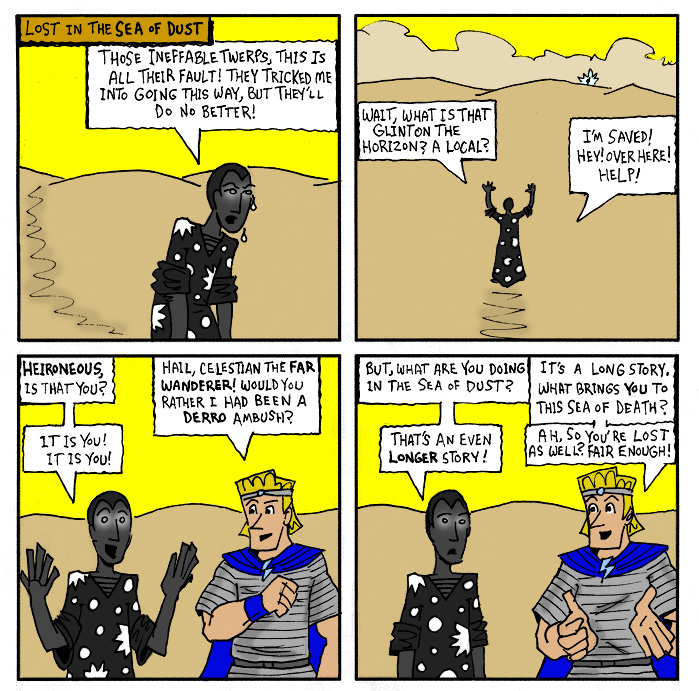 And a new character joins the story! Well he's not new in a Greyhawk sense, but he's new to Gods in Space. Oh whatever! 1. The process of parodying a classic movie is sometimes challenging. In this case, Celestian has to embody the roles of both R2D2 and C3PO. Not an easy task since in A New Hope they split up in opposite directions. Luckily they are reunited. In hindsight it would've been serendipitous to use Celestian as 3PO and his brother Fharlanghn as R2. But Fharlanghn is not the space-y type. Then again, is Heironeous? Eh! 2. I've drawn Celestian many many times in his starry robe, but this time I was quite excited since I got to make a subtle change to it by rolling up his sleeves. Funny how the small details make art enjoyable. 3. The "glint on the horizon" was Heironeous in his armor of course. Curious, if Heironeous reputedly has impenetrable skin then why does he need armor? AFAIK, unlike the Greek hero, he has no Achilles Heel either! Hrm. 4. Celetian's nickname is the Far Wanderer. This is the first time I've referenced that. Given where has been in this comic, that is a truer nickname if I've ever heard one. 5. The Derro ambush line I feel I must explain, is a sly Greyhawk reference to the dark dwelling near-human pygmies who live beneath the Sea of Dust in both Gygax's novel Sea of Death and in numerous other places in the game setting. They are short, conniving folk who capture people and have an affinity for mechanical things(see Doomgrinder). Sounds an awful lot like Jawas to me! 6. One of my biggest suspensions of disbelief in this storyline, has been that the Gods in Space currently can't get anywhere except on foot. All deities in the World of Greyhawk, from most quasi-deity magic-users to demigods to actual gods like Celestian and Heironeous, can teleport with ease. If necessary I'll blame it on a magic disrupting field caused by the Twin Cataclysms. On second thought, these deities travel through Wildspace in a Spelljammer, so maybe they just enjoy a good journey. Shrug! |