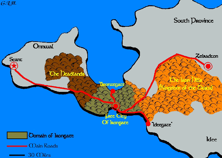 The North Road crosses the 40-mile wide isthmus to the smaller port of Northanchor on the shores of Dunshead Bay and the Sea of Gearnat. Small farming communities as well as isolated farms dot the valley of the Levasslar along the North Road, particularly close to Irongate itself, becoming less and less common to the north up to the junction with Khanahllar. Beyond that point (along either tributary) very few individuals are brave enough to build permanent settlements, such are the dangers of the Headlands. While there is alot of fishing in and around Samryn Bay in the south and Dunhead Bay to the north, most non-seafood for the large city must be imported.Locally produced fresh food is in great demand, so any threats to these farms are taken very seriously.