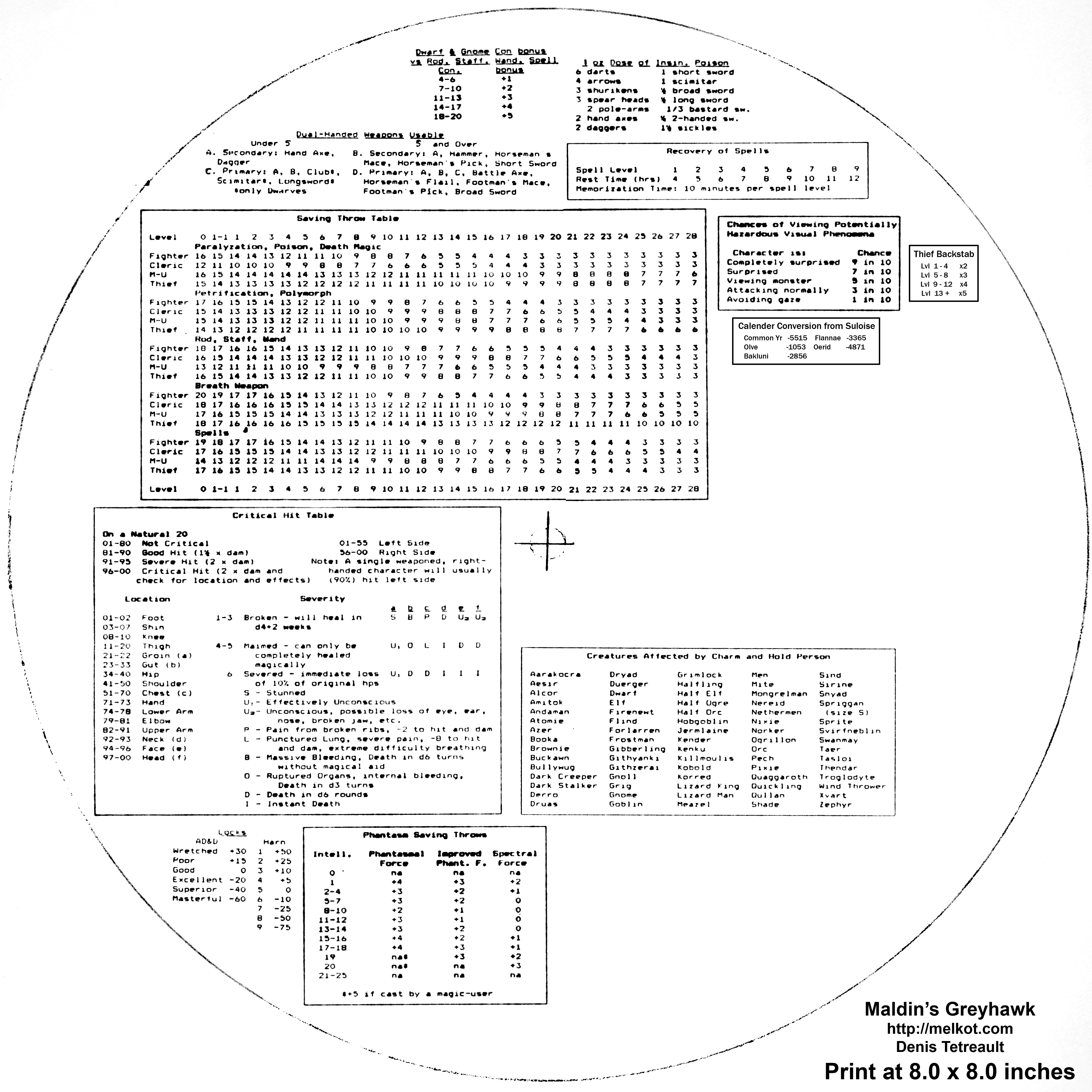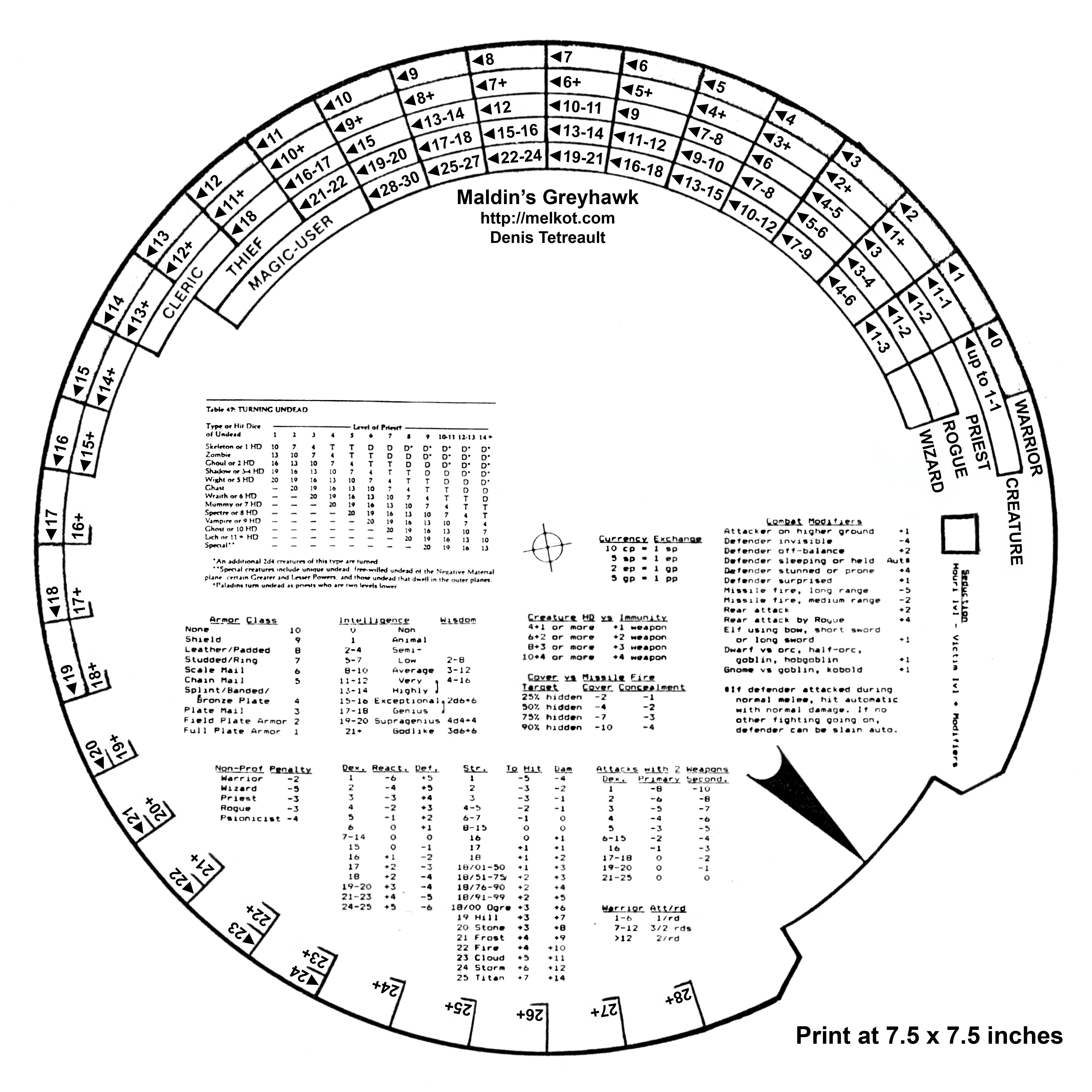 The original Combat Computer was 1st Edition, but I modified it for 2nd Edition AD&D (which I still play), and it could theoretically be modified yet again by other DMs for any edition (or RPG variant). One of the things I didn't particularly like on the original charts was the fact that attack and saving throw progression didn't change for several levels, then would jump 2 (or more) units. On this disk, I smoothed out the level progression for both. Among the other charts that you will see on the front and back of the disks are Strength and Dexterity adjustment tables, Armor Class tables, various situational combat modifiers, clerical undead turning, currency conversion, saving throw tables, intelligence vs. illusion saves, two-handed combat tables, my own critical hit table (also available on my website), non-proficiency penalties, a chart I use for lock difficulty, poison-related charts, cover vs. missile fire, thief backstabbing, a Greyhawk calender conversion, and a few other things. Pretty much 95% of what I commonly need while DMing. It saves a heck of a lot of looking up stuff during play (seeing as the screens are often covered with stuff I don't actually use).