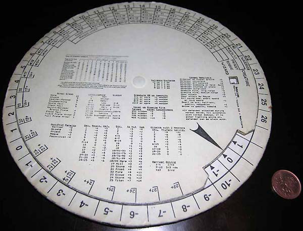 You'll notice a small window cut into the top disk. In my campaign I also have make use of a specialized wizard sub-class of enchanter based on the Houri class from an old issue of White Dwarf Magazine, and that window is a seduction chart (AC arrow points to the difference between the Houri's and victim's level, read the percentage chance of success in the window). I am certain DM's can find other uses for that percentage. There is certainly space on both the front and back sides to add more charts that you might find useful in your own campaign. One could even add more windows like the seduction calculator.